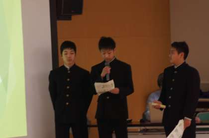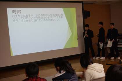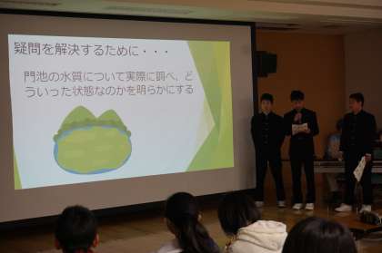 最初の発表は、門池の水と環境について、三ツ木柾翔さん、杉浦宏明さん、中村日翔さんの三人による発表です。門池の水質と生息する魚について調べています。
