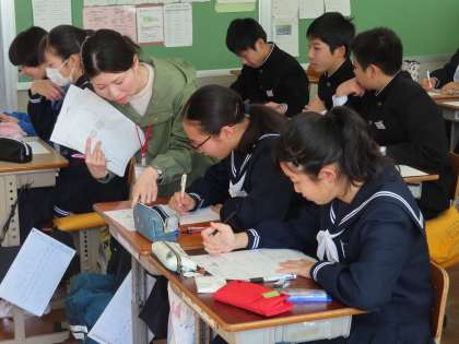 2Cは数学でした。プリント学習です。仲間と教えながら進めています。友達や山開先生や時田先生に積極的に質問していました。