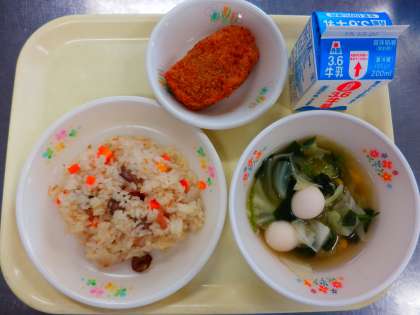 本日はリクエストメニューの「卵とコーンのスープ」でした。野菜がたくさん入っていておいしかったです。黒はんぺんはチーズをサンドイッチしてあり抜群でした。洋のおかずに洋風のツナピラフがマッチしていました。ごちそうさまでした。