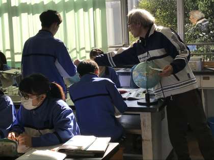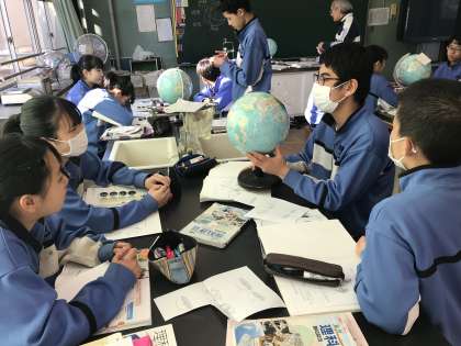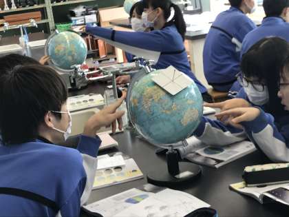 3Cは理科です。天体を観測するに際し、方位や緯度のちがいによる太陽高度の変化について学習しています。地球儀上のマッチが観測している私たちを表しています。