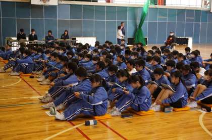 1年生の職業講話です。今日は、沼津信用金庫、米久株式会社、駿東・伊豆消防本部の方々を講師にお迎えし、この仕事を選んだ理由ややりがい、中学生へのアドバイスなどについてお話しいただきます。