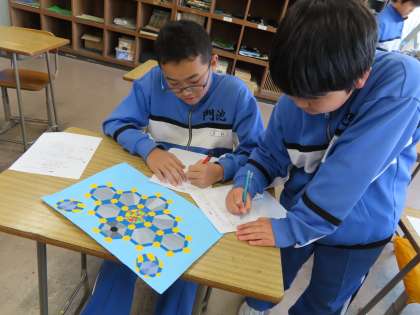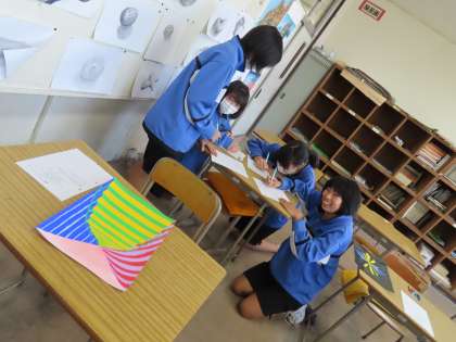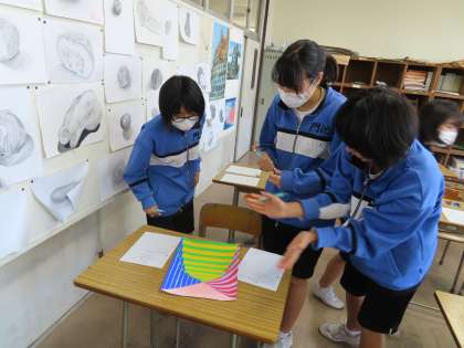 1Aは美術です。鑑賞プリントを使って相互評価をだしています。「クラスメイトの作品と鑑賞プリントを見て感想を書いていく」授業です。いいところをたくさん見つけて、記入していました。