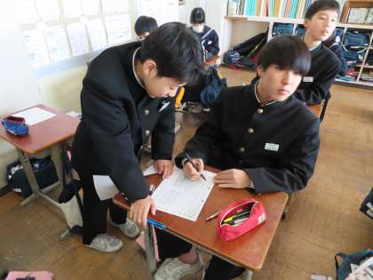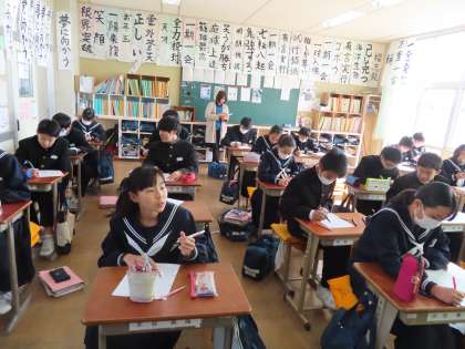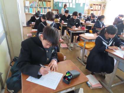 1Cは国語です。五色百人一首(紫)のテストを行ってました。どのくらい覚えているでしょう。最後は交換して答え合わせをしていました。