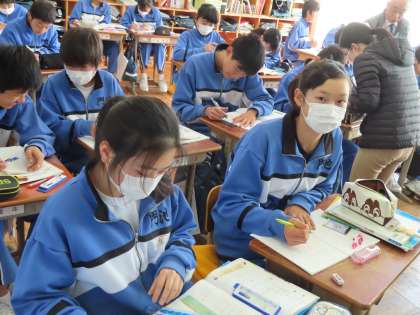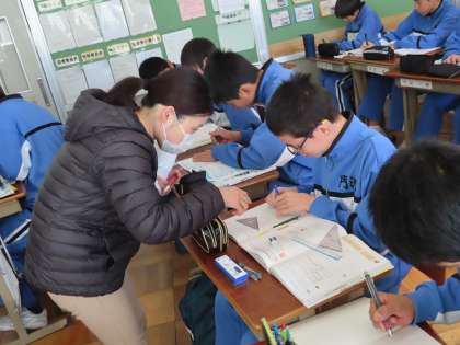 2Bは数学です。「平行四辺形になるための条件」の学習をしていました。まず平行四辺形にするためには、実際に図形を書き考えています。隣の人と仲良くペアで学習を進めていました。支援員の山開さんも参加しています。