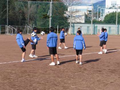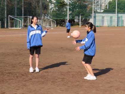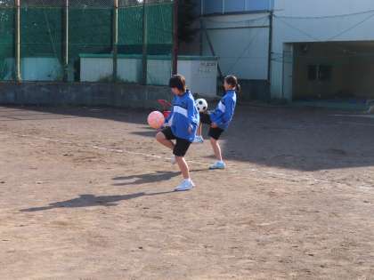 3Aは体育です。サッカーの授業でした。初めはパス練習から行っていました。力強いパスをだしている女子もいました。次にリフティングです。女子が14回続けていました。男子も負けていられませんね。