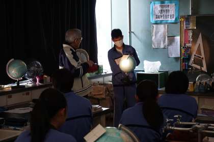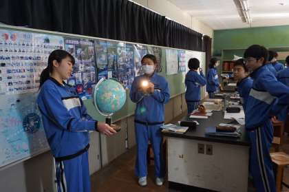 3Dは理科です。地球の公転による、太陽の光の当たり方に違いがあることを、地球儀と懐中電灯を使って観察しています。