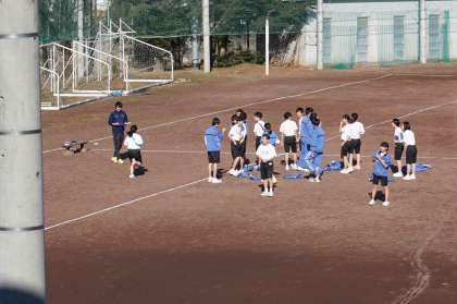 3Cは保体です。駅伝を行っています。つらい長距離走も、駅伝となるとチームで行うため、自然と頑張ろうという気持ちが出てきます。応援する声が生徒から盛んに出されていました。