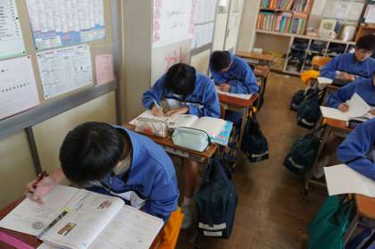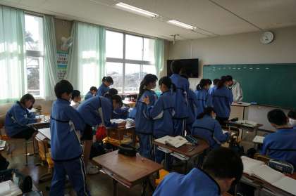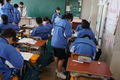 1Aは数学です。空間図形の問題演習です。回答できた生徒は点検を受けています。難しい問題にもチャレンジしています。