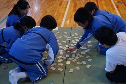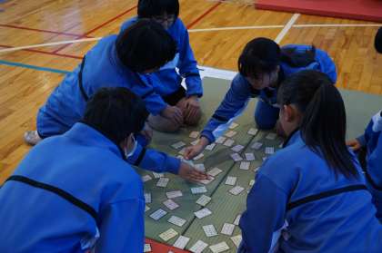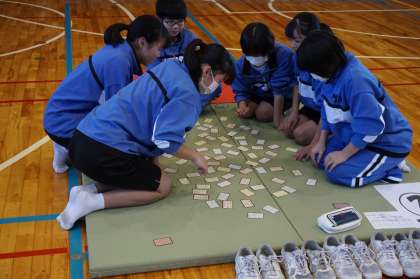 1年生の百人一首大会です。柔道の畳を使用しています。冬休みにたくさん覚えた生徒ががいるようで、上の句を聞いたとたんに札をとる生が多かったです。