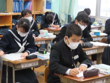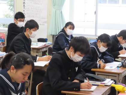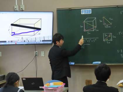 3Cは数学でした。「立体の体積や表面積を三平方の定理を使って求める」を課題として話し合っていました。