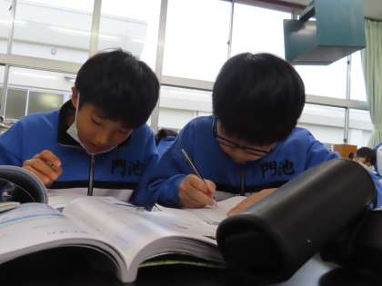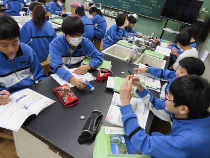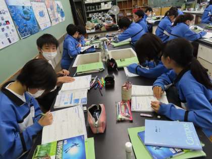 1Cは理科です。単元の確認のための問題にトライしていました。空気の圧力の問題です。わからないところは相談しながら進めていました。