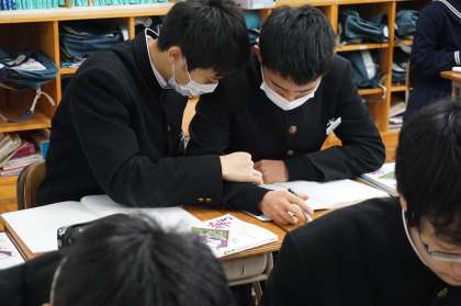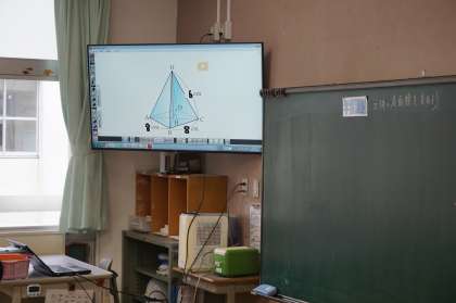 3Dは数学です。三平方の定理を応用して空間図形の体積を求めています。どの部分で三平方の定理を使えばいいのかがよく分かっているようで、お互いに考えながら課題を解決しています。