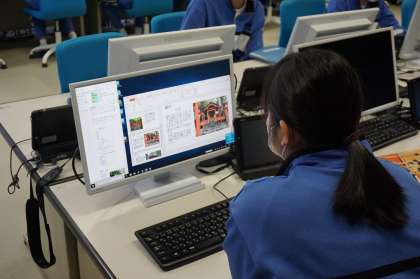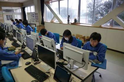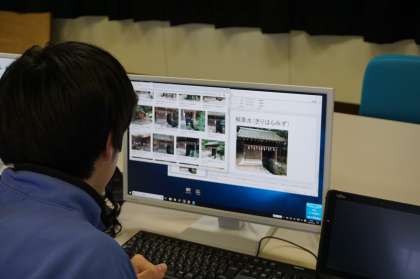 2Bは技術科です。パソコン室でパワーポイントを使って京都や奈良のプレゼンを行うためのものを作成しています。資料から写真を取り込んだりして見栄えのするものを作成しています。