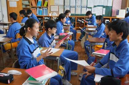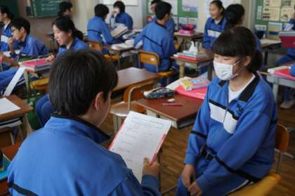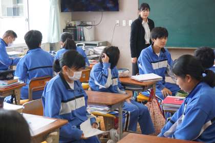 3Aは英語の授業です。英語を使って面接の練習をしているようです。これまで学習した言葉や文法を駆使し、相手に伝えようとしています。