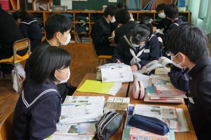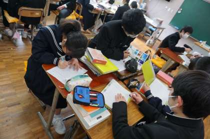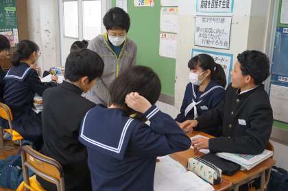 3Cは国語です。俳句の「岩にしみつく」「岩にしみこむ」の違いについて、自分の考えや思いを相手に伝えようとしているようです。聴き手も相手が何を伝えようとしているのかを考えながら聴いています。とても素晴らしいです。