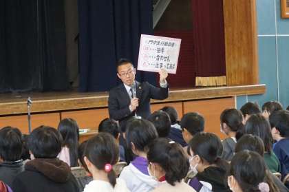 校長先生のお話の後は、中学校生活の説明に入ります。生徒指導の太田先生からは、門池中の生活についての話がありました。門池中の生活の合い言葉である「み・そ・あ・じ」と「は・あ・と」プロジェクトについての説明がありました。