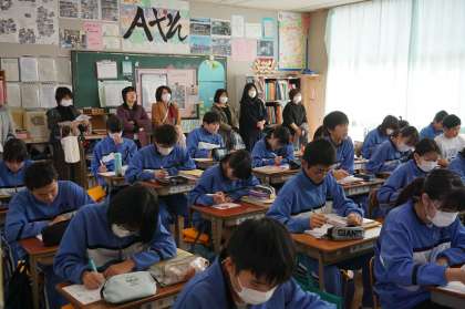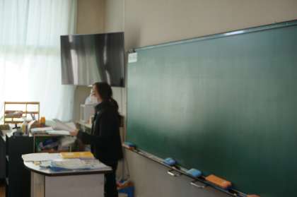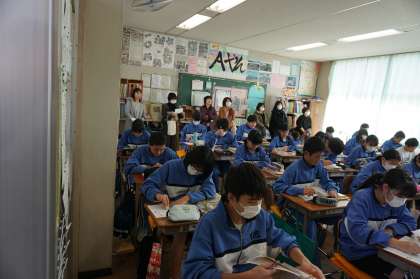A組は英語です。過去形の表し方をプリントで復習しています。動詞の形が変化することや発音が変わることを復習しながら進めています。
