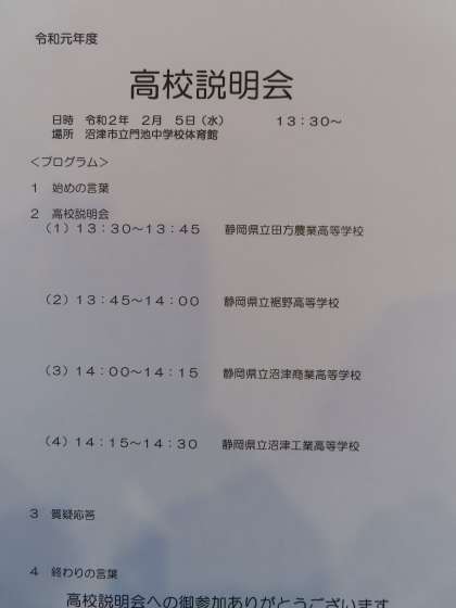 2年生 高校説明会が行われました。田方農業高校・裾野高校・沼津商業高校・沼津工業高校の4校の先生方に来ていただき、説明会が行われました。