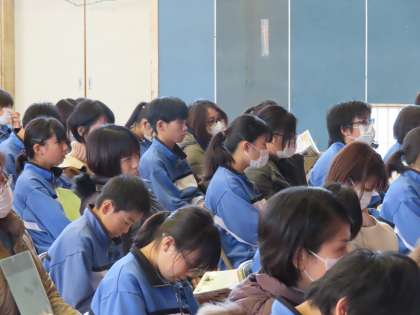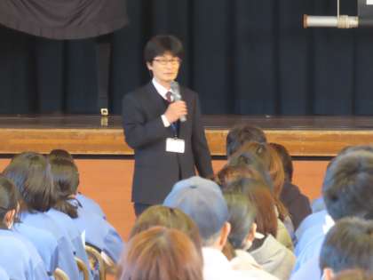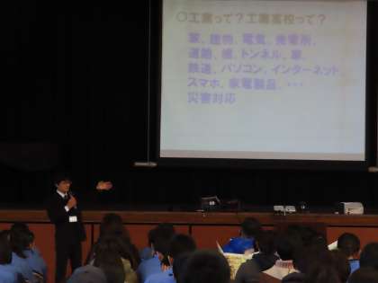 4番目には沼津工業高校です。「工業とは」「資格について」の説明をいただきました。身の回りには工業に関係するものばかりで生活に密着しているとの説明をされました。5つの科、機械科・電気科・電子ロボット科・建築科・都市環境工学科(都市環境類型)・都市環境工学科(環境科学類科)の説明です。就職率は100%です。
