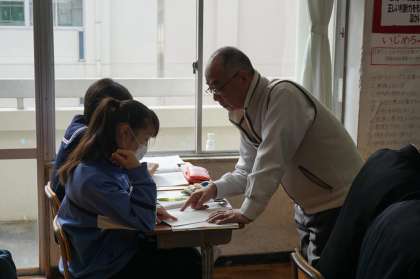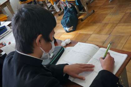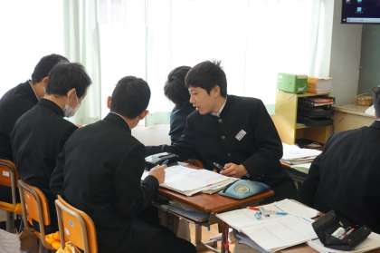 2Aは数学です。平行四辺形の性質を利用した問題を解いています。教え合いながら難しい問題を解いています。