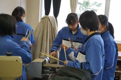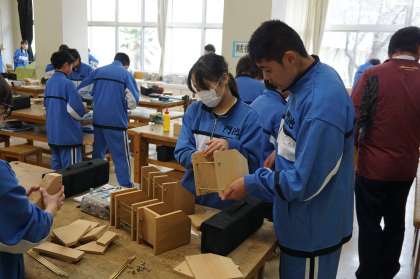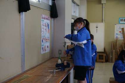 1Dは技術科です。スライドラックの制作です。完成に近づいている生徒が多いようです。いろいろな機械や器具を使っています。