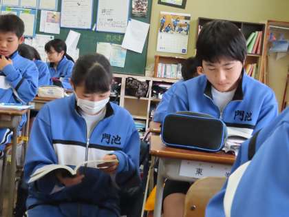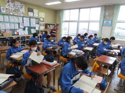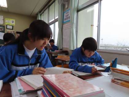 1Bは国語です。「少年の日の思い出」を行っていました。1分間の音読練習です。とても読むのが早くて驚きました。今日は土屋先生もTTで参加して下さっています。