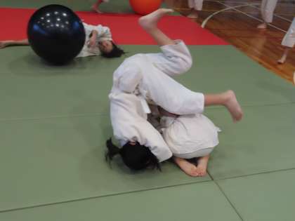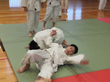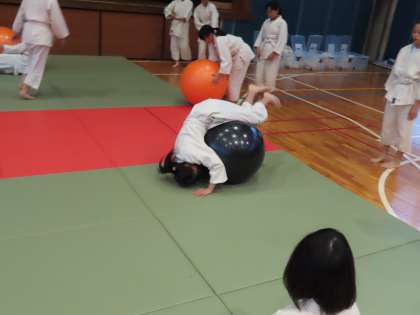 1Cは体育です。柔道の授業を行っていました。前回り受け身の練習です。バランスボールを使っての練習です。ボールの上を乗り越え回りながら最後に受け身を取っていました。上手な回転が生まれています