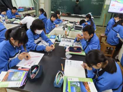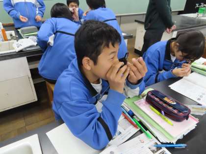 深成岩と火山岩の種類と違い、を行っていました。ルーペで観察用の石をのぞき込んで、表面の違いを感じ取っていました。一人一人にルーペがあって、しっかり観察ができていました。