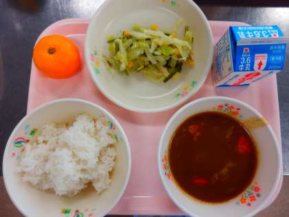 カレーライスはスパイシーで、豚肉も大きく食べ応えがありました。とてもおいしかったです。寿太郎みかんも甘くて、さすが沼津市の特産品ですね。ビタミンCたっぷりで、風邪の予防や疲れを取るはたらきがあります。御家庭でもたくさん食べて下さい。