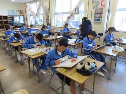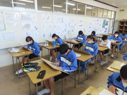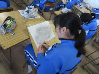 1Dは美術です。自分の上履きなどのデッサンを行っていました。デッサンの手法をいくつか試しながら描いていました。上履きを机に載せて、ひたむきに鉛筆を動かしています。
