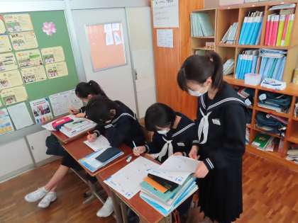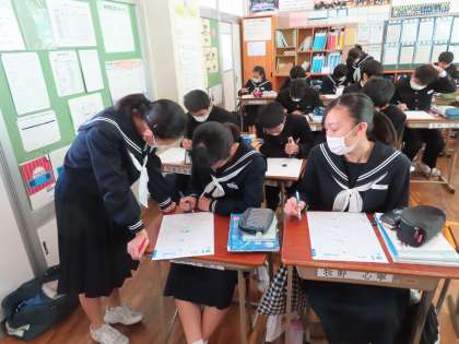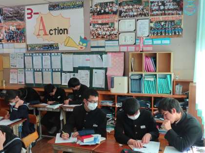 3Aは数学です。数と式の問題プリントを黙々と行ってました。隣同士教え愛学習が進んで行われています。