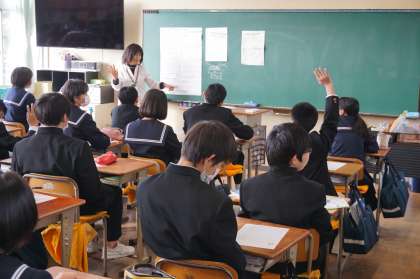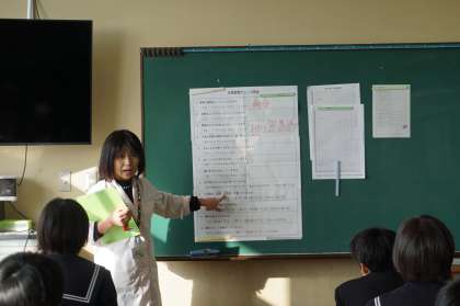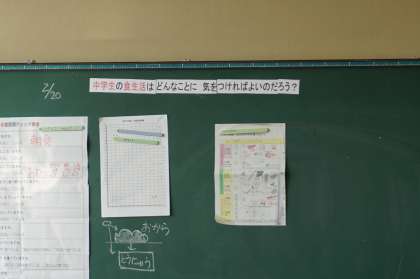 栄養教諭の久保田先生をお迎えして、1年生の各クラスで食育授業を行いました。導入では食習慣チェックシートを用い、普段食べているものの栄養について考えていきました。そしい本題の「中学生の食生活はどんなことに気をつければよいのだろう」に入っていきます。