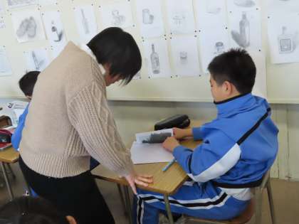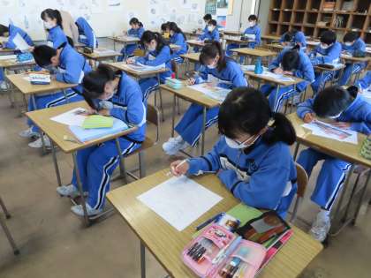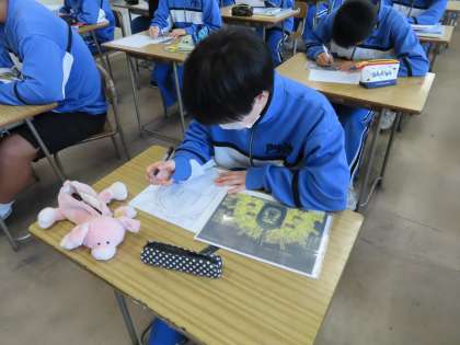 2Cは美術でした。修学旅行の表紙に使用する絵を描いていました。京都奈良に関係している絵を描いていました。