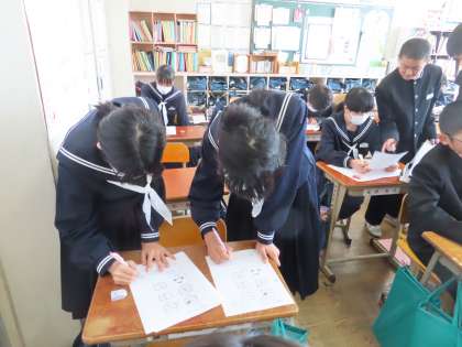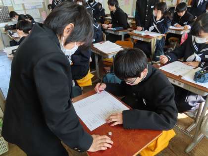1Aは国語でした。期末テストのテスト直しをしていました。直しが終わってしまった生徒は、「思考力プリント」を解いていました。