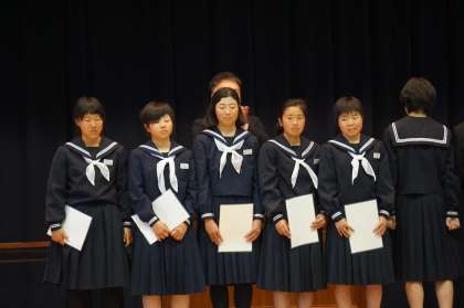 続いて、女子ソフトボールジュニアオリンピック、県選抜選手の5人に認定証を授与しました。大会での活躍を期待します。