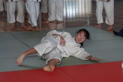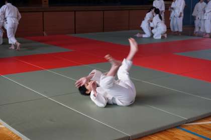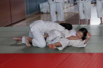 1Aは保体です。柔道の前回り受け身や膝をついての崩しから、寝技に入るところをやっていました。バランスボールを使った練習の成果から、回転は上手にできる生徒が多いようです。