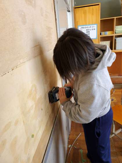 今日は1・2年生の教室や廊下の掲示スペースの傷んだ壁紙を張り替えました。ベッタリ張り付いた壁紙を剥がすのに苦労していましたが、無事きれいに張り替えることができました。