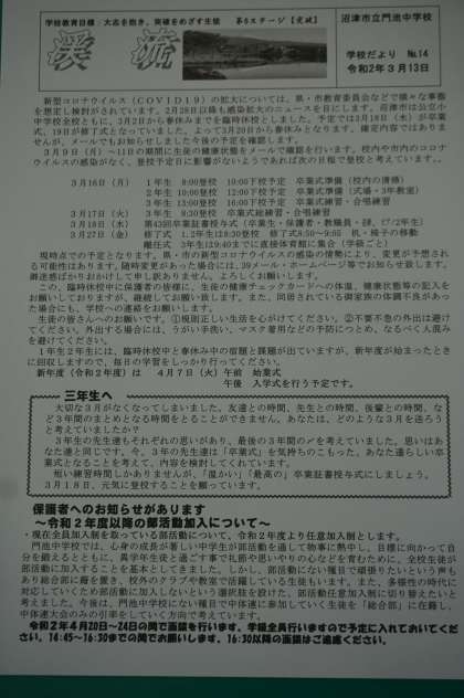 学校だよりです。今後の予定等をお知らせします。御確認ください。配布文書にも13号として入れました。また、3月16日(月)の登校した際生徒に配布します。