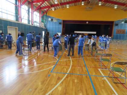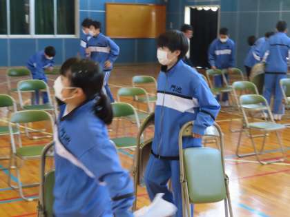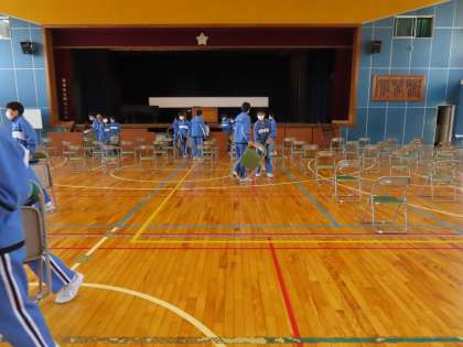体育館では、卒業生・保護者の席の位置を考えながら、椅子を置いていきました。いつももの卒業式より、だいぶ席の間隔を開けています。