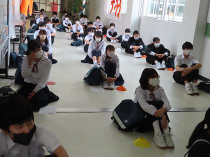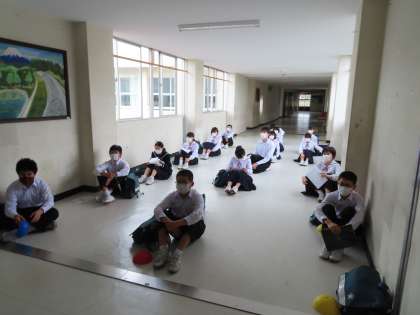 2Bは2階のガンバロードで学級会をしていました。距離をとって座っているため、ホワイトボードの字が見にくかったかも知れません。少し不便ですが、5月中はできるだけの感染防止策をとっています。