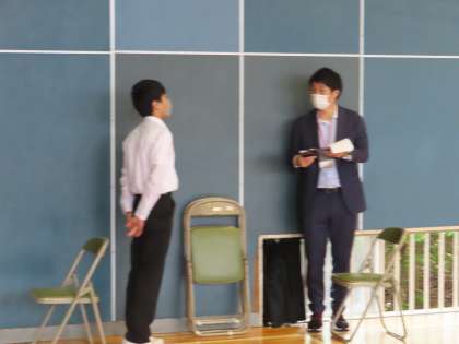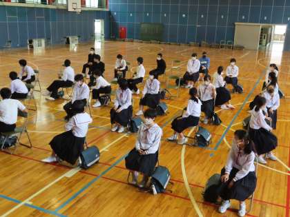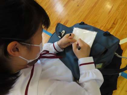 3Bは体育館で学級活動を行っていました。一人一人から係などの希望を聞いています。距離は保っています。分けられたのは、国から配布された「布マスク」です。本人の予備用マスクとして、名前を書いてカバンに入れておきます。