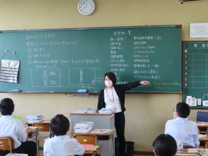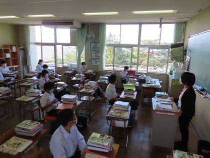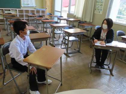 1Bは栗田先生です。半分の生徒の登校です。教室の様子を見ると、間隔を開けて座っています。自分の瀬ではなく、密を避けるための指定席です。面談で休み中の話をしています。