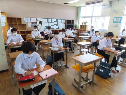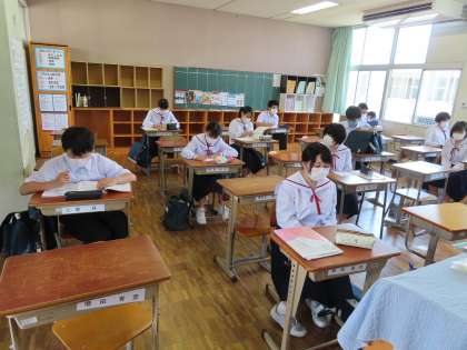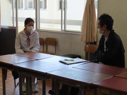露木先生の大きな声が校長室に響いて来ました。写真を撮りにいってみると、AとBの間に立って、同時に2クラス(どちらもA組)に連絡事項を伝えていました。さすが露木先生と思いました。その後は面談を小声でしていました。