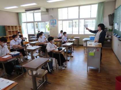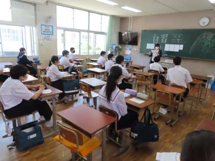 2Cは勝俣先生です。学級単位の登校は始めてなので、少し緊張気味でした。C組も2クラスに分かれて自習をしていました。最後は面談の様子です。