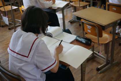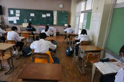 2年B組の様子です。AB組の教室を使い、密を避けて半分ずつの生徒がそれぞれの教室に別れて課題に取り組んでいます。真剣に取り組んでいます。
