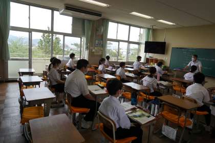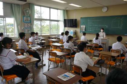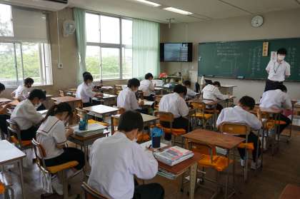 1年生後半は、偶数番号の生徒が登校してきます。門池中の校舎は迷いやすくわかりにくいですが、徐々に慣れてきたようです。B組では、聴力検査の説明が行われていました。