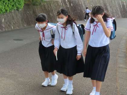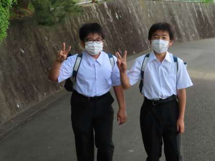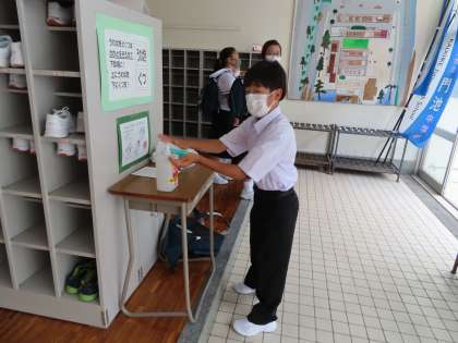 校舎内に入る際には、アルコール消毒をしています。元気なピースサインです。