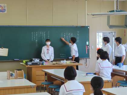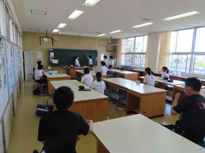 2年生は前半と後半の隙間時間を使って、学年委員会を行っていました。密を避けて広がって話合いをしていました。