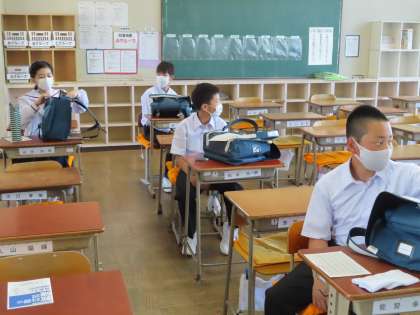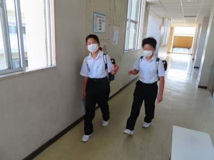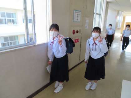 朝の教室前の廊下の様子です。カメラを向けると恥ずかしそうに、ピースをしてくれました。ありがとう!
