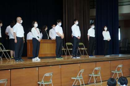最後にコロナウイルス感染防止について、毎日の検温、健康チェックカードの提出、マスクの着用、手洗い、消毒、換気を進めていくこと。部活動が任意加入制になったこと、中体連についてのことについて話されました。その後、職員紹介が行われました。